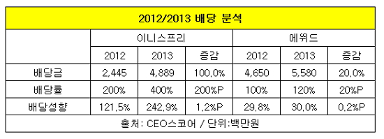두 회사 모두 지난해 실적이 전년보다 크게 개선돼 배당을 늘릴 이유가 있기는 하지만, 실적개선 폭보다 배당금 상승폭이 더 컸다.