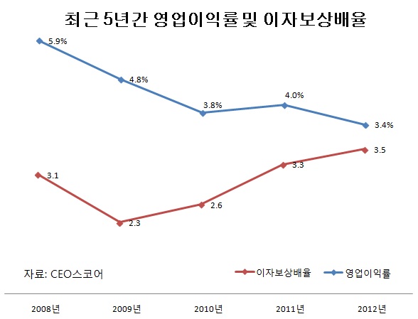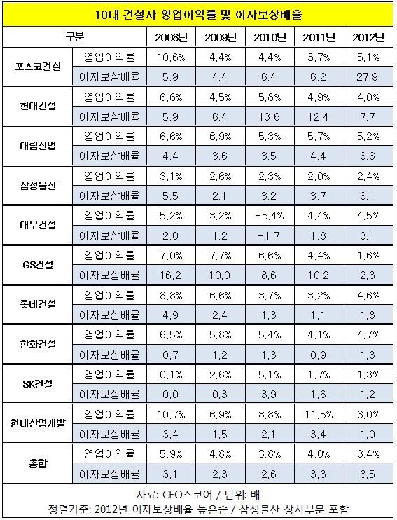 5일 재벌 및 CEO, 기업 경영성과 평가사이트인 CEO스코어(대표 박주근)에 따르면 국내 상위 10개 건설사의 영업이익률은 2008년 5.9%에서 지난해 3.4%로 하락했으나 이자보상배율은 같은 기간 3.1배에서 3.5배로 높아졌다.