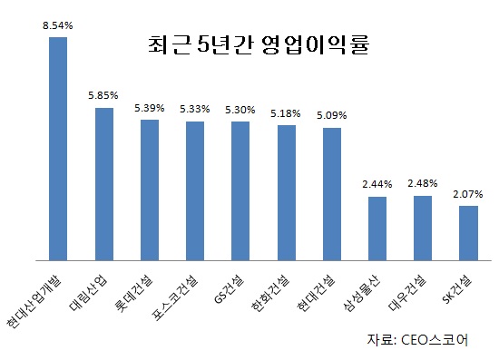 5년간 평균 영업이익률은 현대산업개발이 128조1천억 원의 매출과 10조9천억 원의 영업이익을 거둬 8.5%의 영업이익률을 기록했다.
