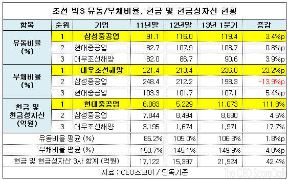 현금 및 현금성 자산은 현대중공업(대표 이재성)이 1조1천73억 원으로 1위를 달렸다. 부채비율은 2012년 말보다 5.4%포인트 높아졌으나 3사 중 가장 낮은 수준을 나타냈다.