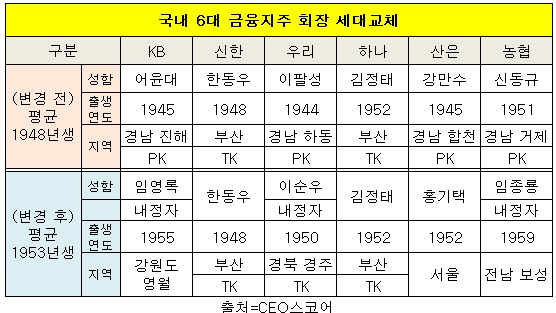 이명박(MB)정부 시절 6대 금융지주 수장들이 모두 TK-PK(대구-경북, 부산-경남) 인사들이었던 반면, 이번에는 세대교체로 출신 지역이 다양해졌다.