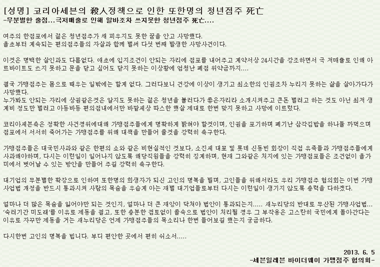[성명] 코리아세븐의 살인(殺人)정책으로 인한 또한명의 청년점주 사망(死亡)