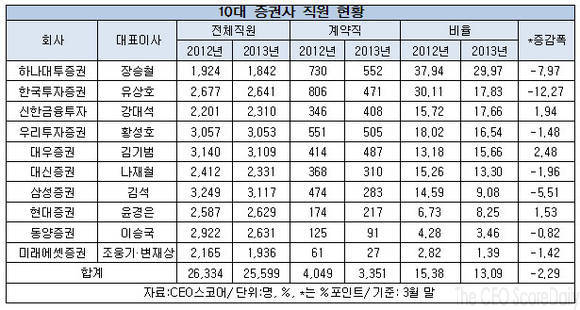 이에 따라 10대 증권사 전체 직원 가운데 계약직 직원이 차지하는 비중은 지난해 3월 15.38%에서 올해 3월 13.09%로 2.29%포인트 낮아졌다.