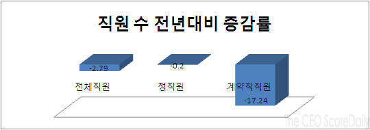이 가운데 계약직 직원은 지난해 4천49명에서 올해 3천351명으로 17.24%나 감소해 전체직원 감소율은 물론, 정규직 감소율 0.23%를 크게 웃돌았다. 임원 및 사외이사를 제외한 정규직 직원은 2만1천645명에서 2만1천595명으로 줄었다.