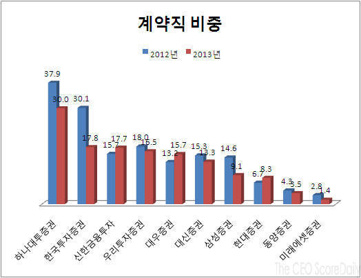신한금융투자(대표 강대석), 우리투자증권(대표 황성호), 대우증권(대표 김기범), 대신증권(대표 나재철)도 계약직 비중이 10%를 초과한 반면, 미래에셋증권(대표 조웅기·변재상)이 1.39%로 가장 낮았다.
