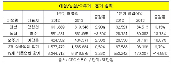 10일 재벌 및 CEO, 기업경영평가사이트인 CEO스코어(대표 박주근)에 따르면, 대상과 농심, 오뚜기 3사의 올해 1분기 매출은 1조5천857억 원, 영업이익은 960억9천600만 원으로 집계됐다.