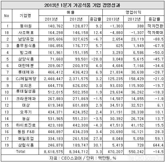 10일 재벌 및 CEO, 기업 경영성과 평가사이트인 CEO스코어(대표 박주근)에 따르면 국내 500대 기업에 포함된 상장 식품기업 19곳의 올해 1분기 총 매출은 8조6천185억 원, 영업이익은 4천702억 원으로 집계됐다.