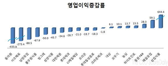 또 대한제분(대표 송영석)이 34.6%, 롯데제과(대표 김용수)가 28.7%, CJ제일제당(대표 김철하)이 21%, 오리온(대표 담철곤)이 19.7%, 롯데칠성음료(대표 이재혁) 18.3%의 영업이익 감소율을 기록했다.