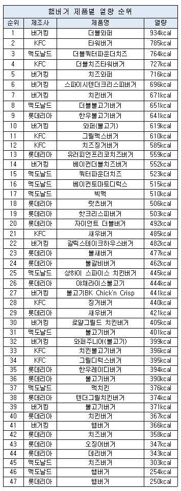 '톱 10' 중에 버거킹 제품이 5개, 맥도날드와 KFC 제품이 각각 2개, 롯데리아 제품이 1개 포함되어 있었다. 반면 가장 열량이 낮은 제품은 롯데리아 '햄버거'로 버거킹 더블와퍼보다 700kcal가량 적은 250kcal이었다.