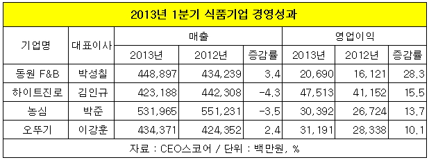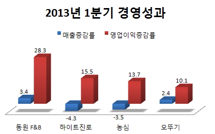 11일 재벌 및 CEO 기업 경영성과 평가사이트인 CEO스코어(대표 박주근)에 따르면 동원F&B는 올 1분기 영업이익이 전년 동기대비 28.3%나 늘었고, 하이트진로는 15.5%, 농심은 13.7%, 오뚜기는 10.1% 증가했다.