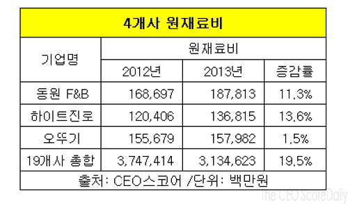 오뚜기는 원재료비 증가율이 1.5%에 그쳐 원가절감에 가장 성공적인 모습을 보였으며 동원F&B와 하이트진로는 두자릿수 증가율을 보였지만 19개사 전체 평균 19.5%보다는 낮았다.