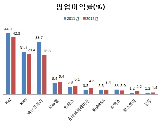 NXC는 영업이익률이 지난해 42.3%였고, NHN이 29.4%로 그 뒤를 이었다. 넥슨코리아는 2011년 38.7%에서 28.8%로 영업이익률이 10% 포인트 가까이 떨어지면서 3위로 밀려났다.