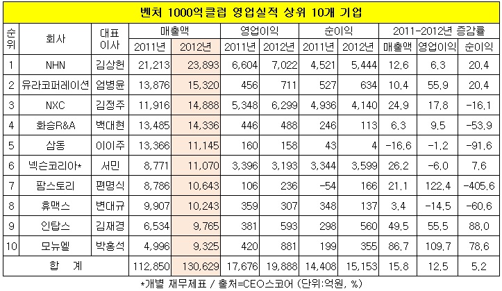12일 재벌 및 CEO 기업 경영성과 평가사이트인 CEO스코어(대표 박주근)에 따르면 벤처기업으로 출발해 '매출 1천억 클럽'에 가입한 329개 업체 가운데 NHN이 지난해 매출 2조3천893억 원으로 1위를 기록했다.