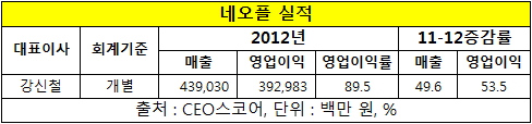 12일 재벌 및 CEO 기업 경영성과 평가사이트인 CEO스코어(대표 박주근)가 벤처기업으로 시작해 매출액 1천억 원 이상을 달성한 기업들을 대상으로 조사한 결과, 넥슨코리아(대표 서민)의 자회사인 네오플(대표 강신철)이 지난해 영업이익률 89.5%, 순이익률 69.6%로 압도적인 수익성을 자랑했다.