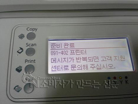 1년 반 넘게 아무 이상 없이 작동하던 복합기의 액정 화면에 얼마 전부터 '091-402 프린터 고객지원센타에 문의해주십시오'라는 문구가 반복적으로 떠 고객센터에 문의했다.