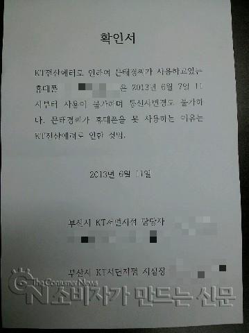KT 측은 자사 약관에 근거해 보상안을 제시했지만 문 씨와 입장차가 있어 더디게 진행되고 있는 상황이라는 입장이다.