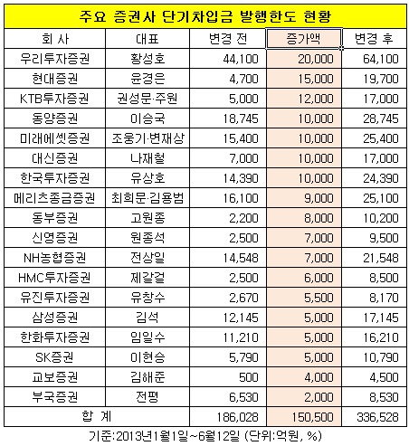 이들 증권사가 발행한도를 다 채울 경우 단기차입금 총액은 기존 18조6천28억 원에서 33조6천528억 원으로 80.9%나 증가하게 된다.