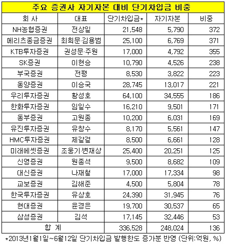 단기차입금 발행한도가 6조원 대에 달하는 우리투자증권은 자기자본이 3조 원이 넘어 그 비중이 채 200%가 안됐다. 마찬가지로 자기자본 규모가 3조 원이 넘는 한국투자증권, 현대증권, 삼성증권도 단기차입금 비중이 80%에 못 미쳤다.