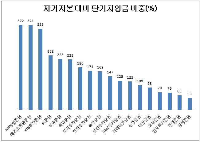 단기차입금 발행한도를 자기자본과 비교하면 NH농협증권이 자기자본의 372%로 가장 높았다.
