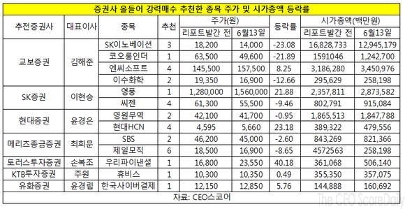올해 가장 많은 강력매수 의견을 제시한 곳은 교보증권(대표 김해준)으로 SK이노베이션, 코오롱인더, 엔씨소프트, 이수화학 등 4개 종목을 강력 추천했다. 하지만 엔씨소프트를 제외한 나머지 3개 종목은 보고서 발간 이후에 주가가 하락세를 면치 못했다. 교보증권은 SK이노베이션에 대해 올해만 3차례나 강력매수 의견을 내놨지만 해당 종목의 주가는 리포트 발간 전 1만8천200 원에서 최근 1만4천 원으로 6개월 만에 23.08%나 떨어졌다.