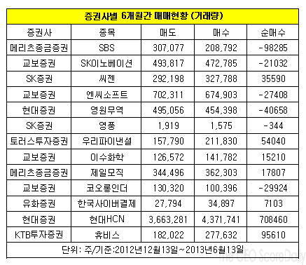 심지어 일부 증권사들은 자기 회사 애널리스트들이 강력 매수를 추천한 종목을 오히려 내다파는 모습을 보여 일반 투자자들을 끌어들여 차익을 얻기 위해 종목 보고서를 악용하는 것 아니냐는 의혹마저 불거지고 있다. 실제 해당 종목을 추천한 증권사들의 매매현황을 살펴본 결과 13개 종목 중 6개 종목에 대해 순매도를 진행한 것으로 드러났다.