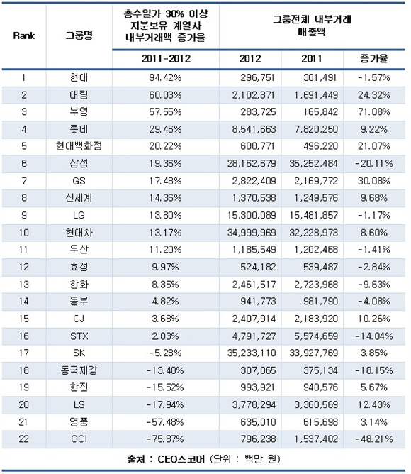 총수일가 지분 30% 이상 기업의 내부거래 증가율을 그룹별로 보면, 현대그룹이 94.4%로 가장 높고, 다음은 대림(60.0%), 부영(57.6%), 롯데(29.5%), 현대백화점(20.2%) 그룹 순으로 나타났다.
