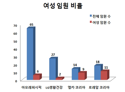 아모레퍼시픽과 LG생활건강의 전체 여직원 가운데 여성 임원이 차지하는 비중은 각각 0.2%와 0.1%로 국내 10대 그룹 평균 0.07%를 크게 웃돌았다. 하지만 외국계 화장품업체와 비교하면 국내 화장품업체의 여성 임원 비중이 현저하게 떨어진다.