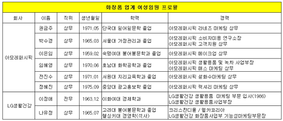 아모레퍼시픽의 여성임원은 메이크업 담당인 이은임(54) 상무와 고객지원 담당인 박수경(48) 상무, 매스 마케팅을 맡은 임혜영(43) 상무, 각각 설화수와 라네스 마케팅을 담당한 전진수(42) 상무와 권금주(42) 상무, 럭셔리 마케팅의 정혜진(38) 상무가 있다.