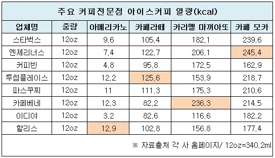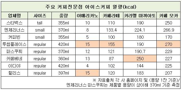 같은 용량을 기준으로 할 경우 열량이 거의 없는 아이스 아메리카노를 제외하고 여름철 가장 많이 팔리는 아이스 카페라떼는 투썸플레이스→엔제리너스→파스쿠찌→스타벅스→할리스→커피빈→이디야→카페베네 순으로 열량이 높았다.