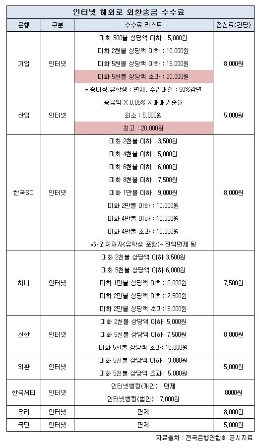 신한은행과 외환은행은 ‘5천달러 상당액 초과’라는 기업은행과의 동일한 기준 적용 시 각각 절반가인 1만원, 1/4에 해당하는 5천원에 송금이 가능했다.