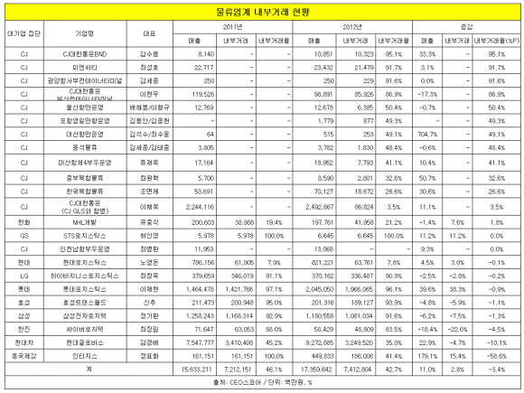 한편, CJ대한통운BND(대표 김수용) 등 12개 사는 작년에 CJ계열사로 새로이 편입돼 2012년부터 내부거래액이 책정됐다.