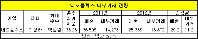 이에 따라 네오플럭스의 내부거래 비중은 2011년의 39.1%에서 지난해 61.4%로 22.3%포인트 상승했다.