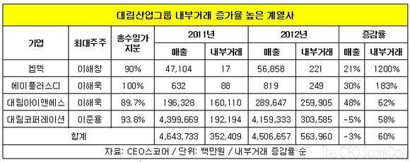 내부거래액은 전년보다 183%나 늘었다. 대림아이앤에스(대표 이병찬)는 지난해 2천896억 원의 매출 중 2천599억 원을 내부거래로 올려 내부거래액이 62%나 늘었다.