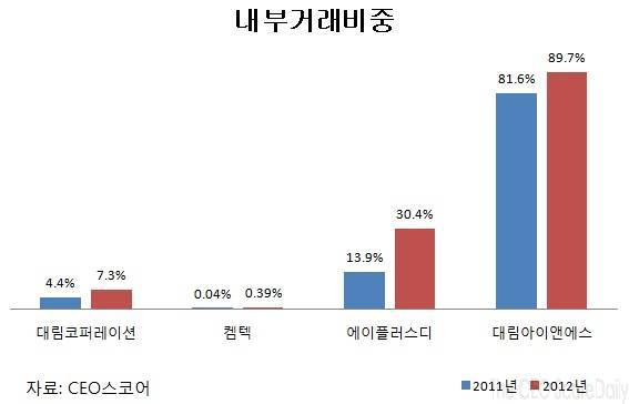 내부거래 비중이 가장 높았던 회사는 대림아이앤에스였다. 대림아이앤에스는 지난해 내부거래 비중이 89.7%로, 전년도 81.6%와 비교해 1년 새 8.1%포인트 늘었다. 이 회사는 현재 대림산업그룹 2세인 이해욱 부회장이 89.7%의 지분을 보유해 최대주주로 등재돼 있다.