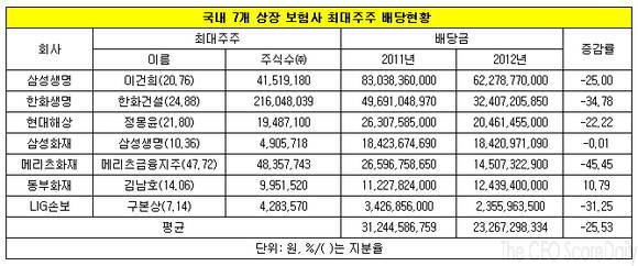 오너 가운데 가장 많은 배당금을 받은 사람은 삼성생명 지분 20.76%를 보유한 이건희 회장으로 622억 원을 기록했다. 이는 지난해 배당금 830억 원 보다 25.06% 감소한 금액이다. 정몽윤 현대해상 최대주주이자 이사회 의장은 21.80%의 지분을 보유해 204억 원의 배당금을 챙겼다. 지난해보다는 22.22% 감소한 규모다.