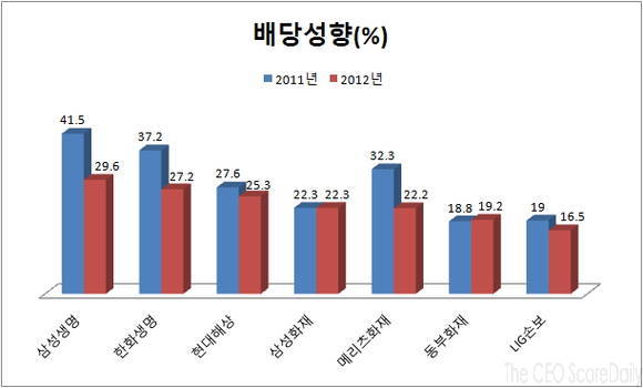 삼성생명(대표 박근희)의 배당성향은 지난해 41.5%에서 올해 29.6%로 11.9%포인트 하락했고, 한화생명(대표 차남규)은 37.2%에서 27.2%로, 현대해상(대표 이철영, 박찬종)은 27.6%에서 25.3%로 각각 낮아졌다.