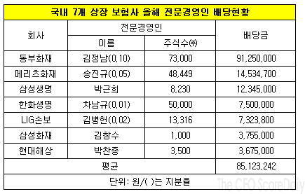 전문경영인(CEO)들은 평균 8천512만원 수준의 배당금을 가져갔다. 김정남 동부화재 사장은 자사주 7만3천주를 보유해 9천만 원을 배당받아 전문경영인 중 1위를 기록했다.