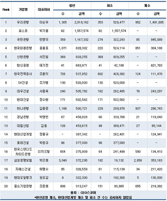 금액기준으로 소송 몸살이 가장 심한 기업은 우리은행(행장 이순우)으로 1천305건에 소송가액은 2조180억 원에 달했다. 제소가 피소보다 건수나 금액에서 월등히 많았는데 제소는 952건에 1조4천920억 원, 피소는 353건에 5천260억 원으로 거의 3분의 1 수준이었다.