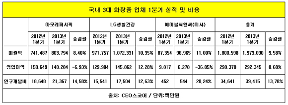 아모레퍼시픽과 LG생활건강, 에이블씨엔씨는 올 1분기에 연구개발비로 총 394억 원을 투자한 것으로 집계됐다. 이는 지난해 같은 기간 346억 원에 비해 13.78% 증가한 금액이다.
