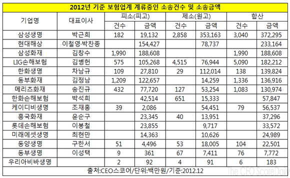 [소비자가만드는신문=김문수 기자] 국내 500대 기업에 포함된 보험사들 가운데 LIG손해보험(대표 김병헌)과 삼성생명(대표 박근희)이 수천 건의 소송을 제기하며 가장 많은 송사에 휘말려 있는 것으로 나타났다.