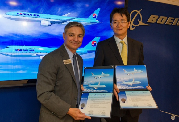 회사측은 지난 18일(현지시간) 프랑스 파리 에어쇼 현장에서 조원태 대한항공 경영전략본부장(부사장)와 레이 코너 보잉사사장 등이 참석한 가운데 B747-8i 기종 5대와 B777-300ER 6대 등 총 11대를 구매하기로 양해각서(MOU)를 체결했다.