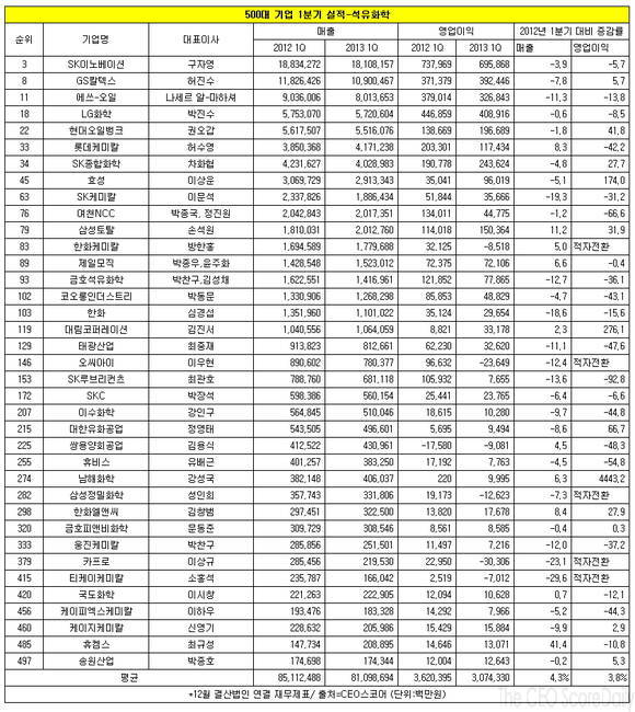 석유화학 업종에서 외형규모가 가장 큰 곳은 SK이노베이션(대표 구자영)로 73조3천300억 원의 매출을 올렸다. 이어 GS칼텍스(대표 허진수)가 10조9천4억 원, 에쓰오일(대표 나세르 알 마하셔)이 9조360억 원, LG화학(대표 박진수)이 5조7천5530억 원, 현대오일뱅크(대표 권오갑)가 5조6천175억 원으로 5위권에 올랐다.