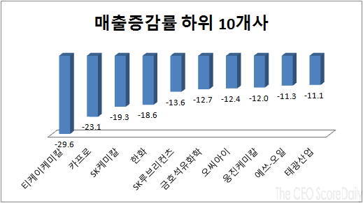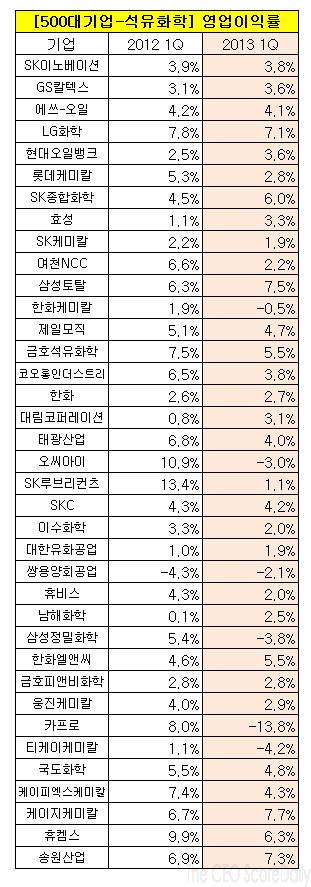 영업이익이 가장 많이 감소한 곳은 카프로로 전년대비 232.05%나 줄어 적자 전환했다. 한화케미칼(대표 방한홍)은 태양광 부분의 영업이익이 줄면서 전체 영업이익이 전년보다 126.52% 감소하며 적자에 빠졌고 오씨아이(대표 이우현) 역시 124.47% 감소로 적자를 기록했다. 반면 남해화학(대표 강성국)은 영업이익(99억 원)이 전년대비 4443%나 늘어 증가율 1위를 기록했다. 대림코퍼레이션(대표 김진서)이 276.15% 증가율로 그 뒤를 이었다. 업계 평균 영업이익률은 3.8%로 전년보다 0.5%포인트 떨어졌다. 특히 카프로와 티케이케미칼, 삼성정밀화학(대표 성인희), 오씨아이, 한화캐미칼은 마이너스 영업이익률을 기록하며 체면을 구겼다.