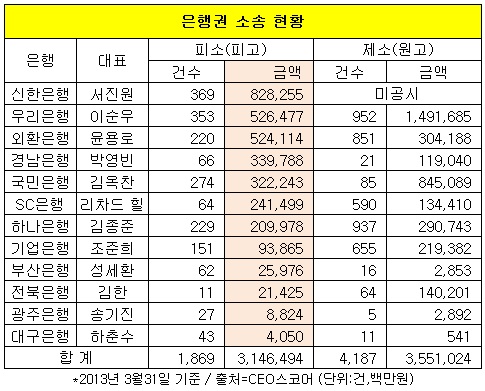 피소규모 1위인 신한은행은 소송 제기건수와 금액을 공개하지 않았다.