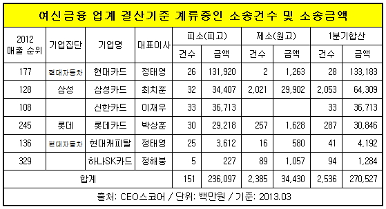 공시 상 가장 많은 금액을 피소 당한 곳은 현대카드였고, 반대로 가장 많은 금액의 소송을 제기한 곳은 삼성카드였다. 총 건수의 81%를 차지했다.