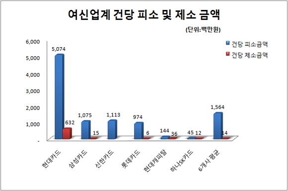현대캐피탈의 피소 건수는 25건, 제소건수는 16건이며, 하나SK카드는 각각 5건과 89건으로 집계됐다.