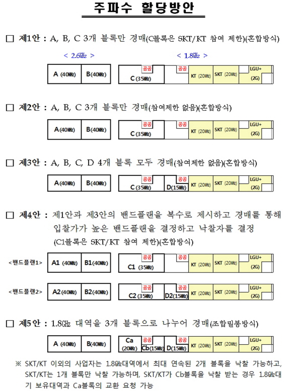 1안은 A, B, C 3개 블록만 경매하되 C블록은 LG유플러스(부회장 이상철)만 경매에 참여할 수 있도록 한 방안이며 2안은 1안에서 C블록의 경매제한을 풀고 3개사가 모두 경매에 참여할 수 있게 한 방안이다.