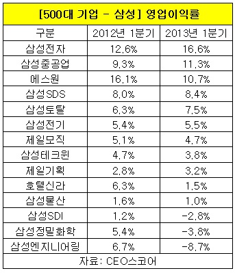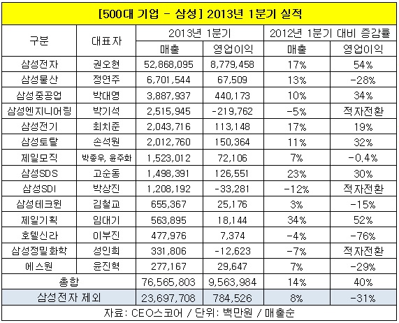 삼성전자는 올해 1분기 8조7천억 원의 영업이익을 거둬, 전년도 동기 5조6천억 원에 비해 54%나 증가했다. 제일기획이 52%, 삼성중공업이 34%, 삼성토탈이 32%, 삼성SDS가 30% 늘었다.