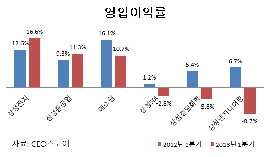 이에 반해 호텔신라는 올 1분기 영업이익이 76%나 쪼그라들었고, 에스원(대표 윤진혁)이 29%, 삼성물산이 28%, 삼성테크윈(대표 김철교)이 15% 감소했다. 삼성엔지니어링과 삼성SDI, 삼성정밀화학은 올해 1분기 적자전환하며 심각한 부진에 빠졌다.