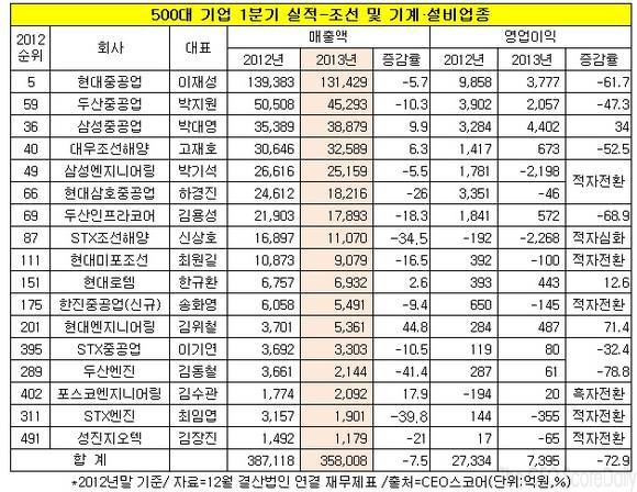 삼성엔지니어링(대표 박기석)과 한진중공업(대표 송화영), 포스코그룹의 성진지오텍(대표 김장진), 현대중공업그룹의 현대미포조선(대표 최원길)과 현대삼호중공업(대표 하경진), STX그룹의 STX조선해양(대표 신상호)와 STX엔진(대표 최임엽) 등 7개사는 적자전환하거나 적자규모가 심화됐다.